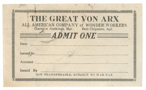 A large chromolithograph die-cut depicting a horse-drawn trolley heading “direct to Barnum’s Circus/Greatest Show on Earth,” filled with men and women. One passenger’s head missing, two of them taped, else in good condition.