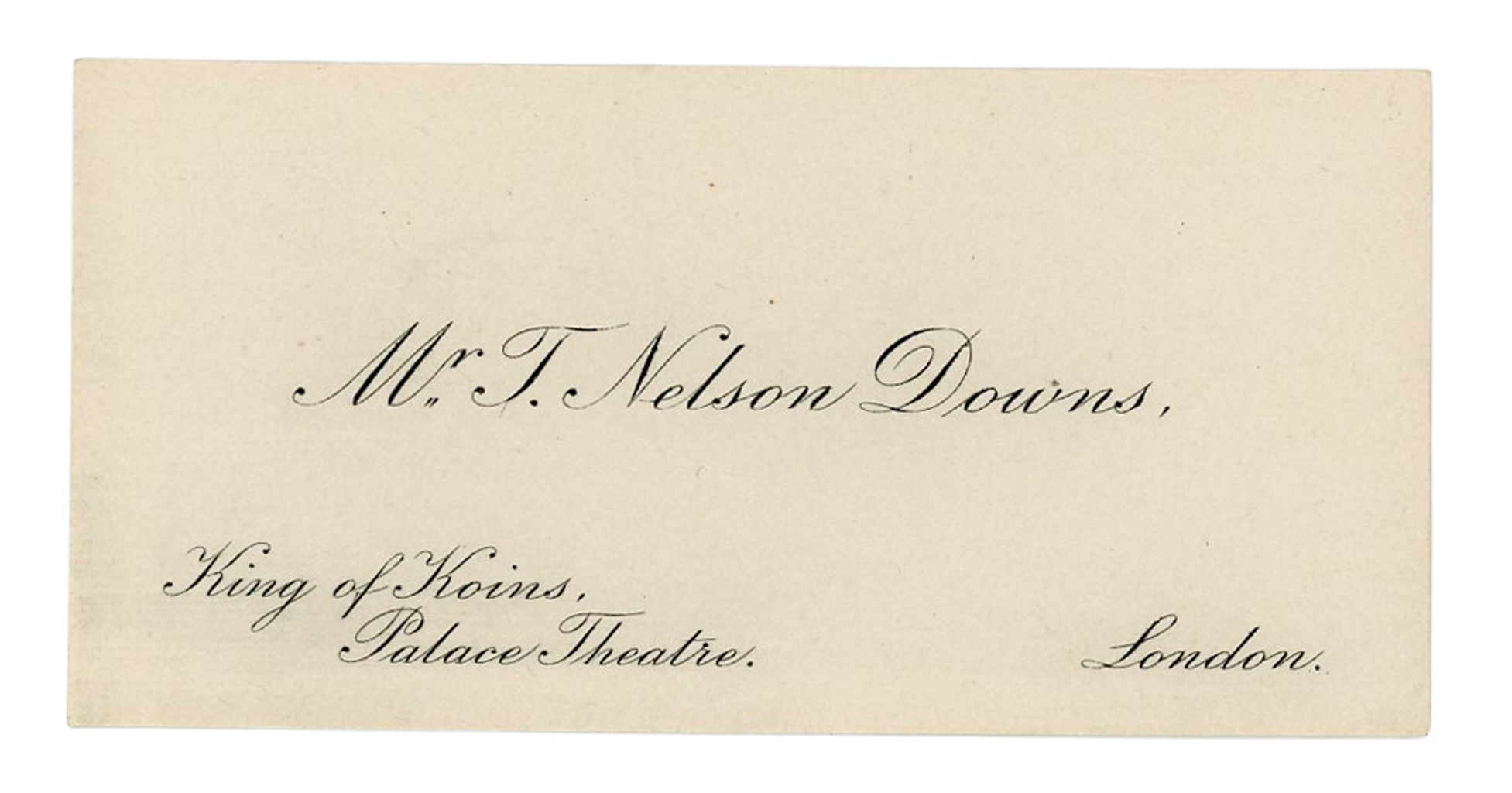 Business card for T. Nelson Downs from his early days in the UK at the Palace Theater where he made his great triumph as a specialty magic act. Not to be confused with the later reprints which were widely distributed. Mild wear, else in very good condition.