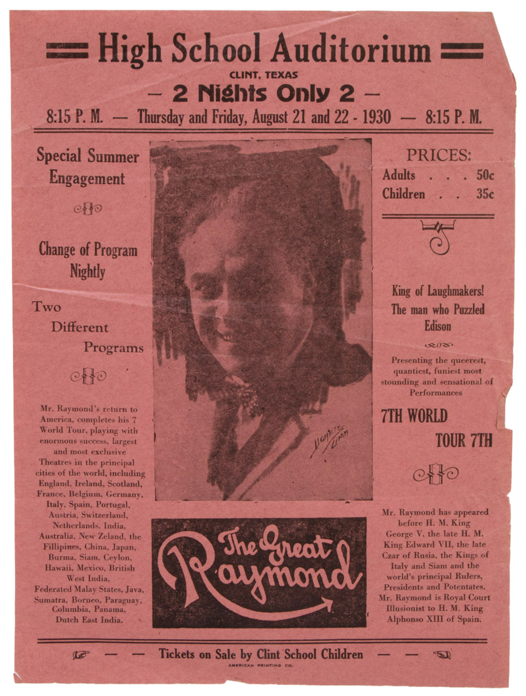 Flyer for The Great Raymond’s shows in Clint, Texas. Small chips and mild toning, else in good condition.