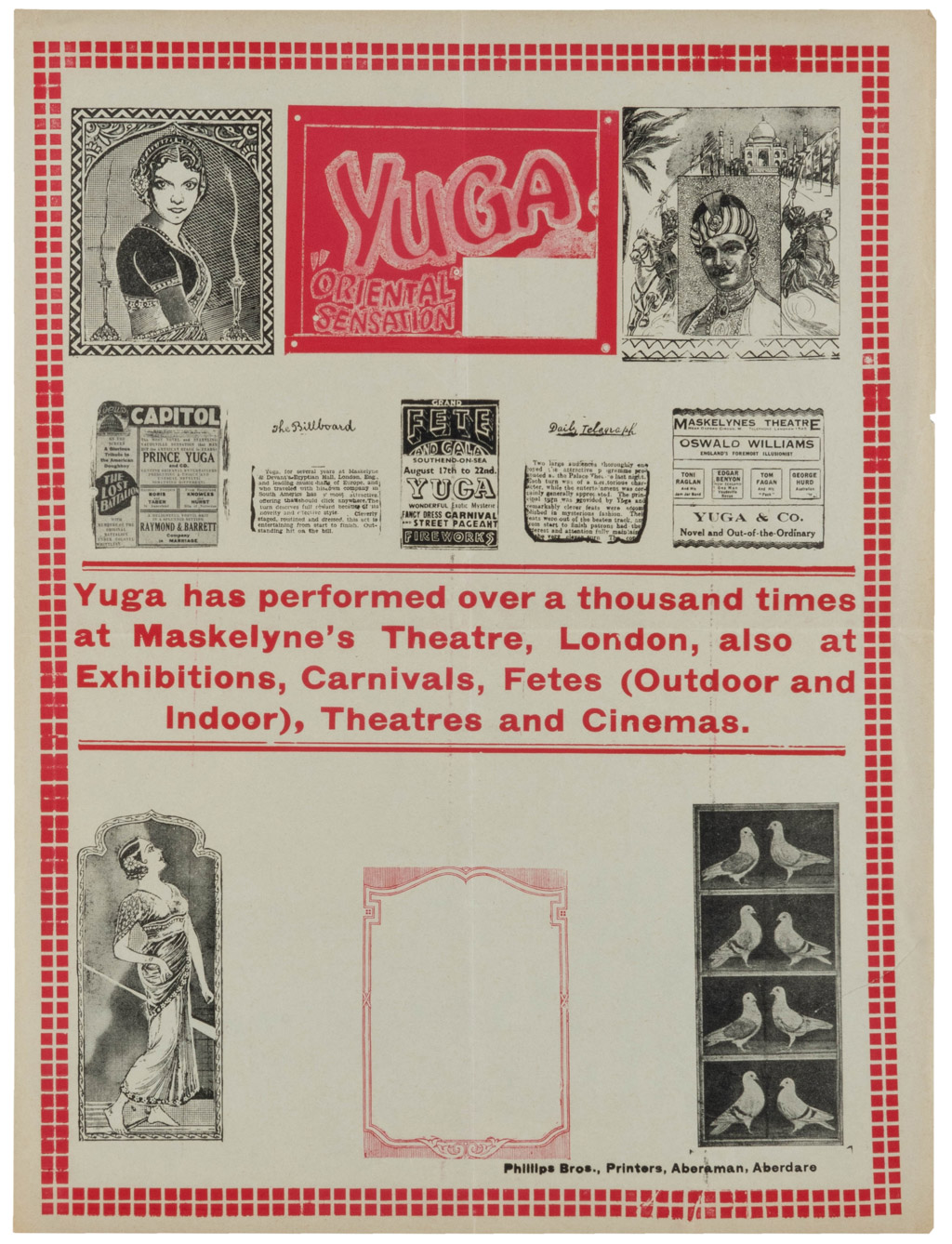 Two-color flyer advertising the magician, including excerpts from programs and magazines, and adding that Yuga “has performed over a thousand times at Maskelyne’s Theatre, London.” Chips and mild toning. Unmounted. B-.