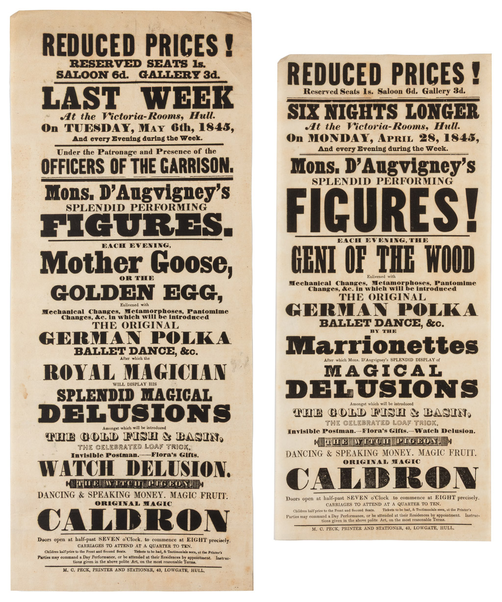 Two similar letterpress broadsides for a magician's appearance at the Victoria Rooms, Hull, in April and May of 1845, featuring his “Splendid Performing Figures" and detailing the magic tricks he will present with fanciful names common at that time. Unmounted. Minor staining and creasing. Overall, very good. Little is known of D'Augvigney, but for more information about his partnership with Mr. Shaw (the Royal Magician), see “The Rich Cabinet of Magical Curiosities" No. 415. Each with Dawes label to verso.