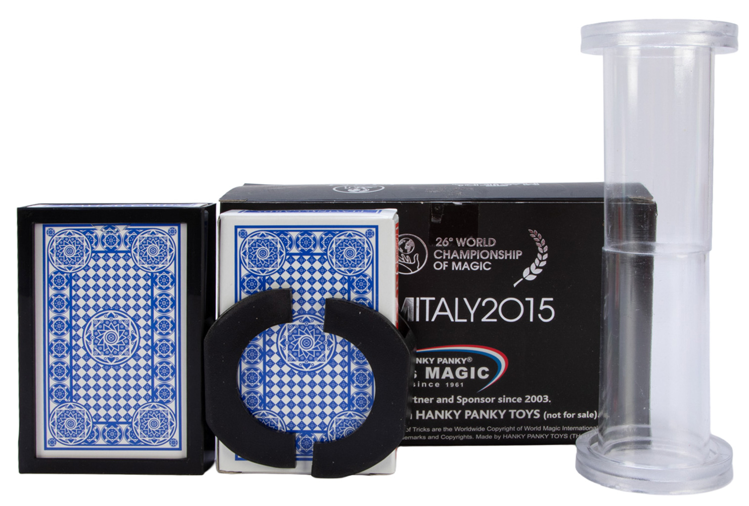 The magician takes a deck of cards out of a box, takes a playing card from the box, and after that makes the complete deck of cards disappear by moving the card over the box! Includes the original box and instructions. Very good condition.