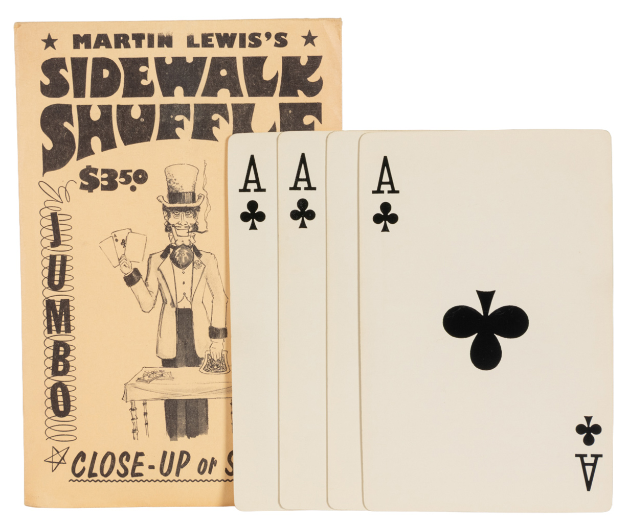 A comedic jumbo monte routine involving an ace of clubs and three blank cards. Includes the original envelope and instructions. Toning, else in good condition.