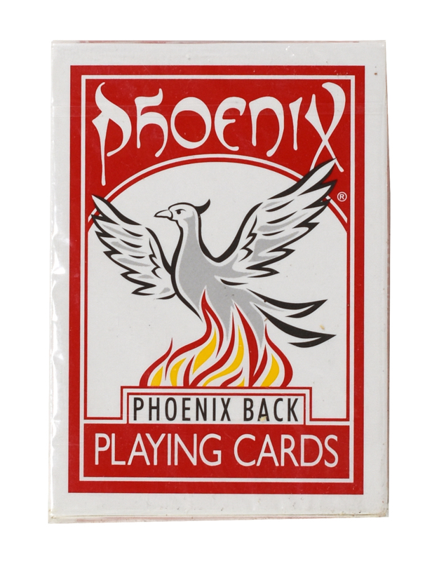 Deck of Phoenix Back playing cards in the original box, Air Cushion Finish. Original plastic wrapping, sealed. A gaffed deck created for magicians and card-sharpers. Deck contains two Aces of Diamonds, Hearts, and Clubs.