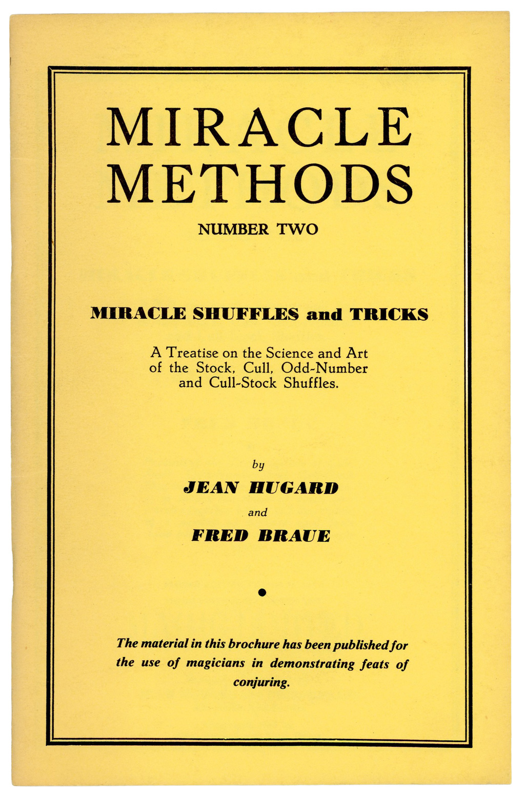 Third edition. Miracle Shuffles and Tricks: A Treatise on the Science and Art of the Stock, Cull, Odd-Number and Cull-Stock Shuffles. Yellow wrappers, 24 pages. Mild toning to covers, else in very good condition.