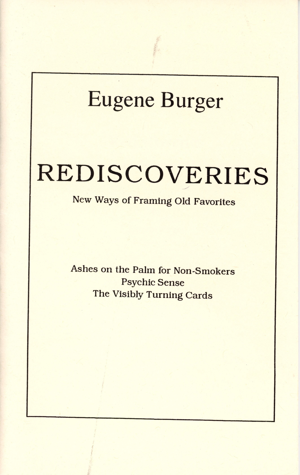 Rediscoveries: New Ways of Framing Old Favorites. Second revised printing. Wrappers, 27 pages. Faint soiling spot to front cover, else in very good condition. More than one copy available; condition may vary slightly from photo.
