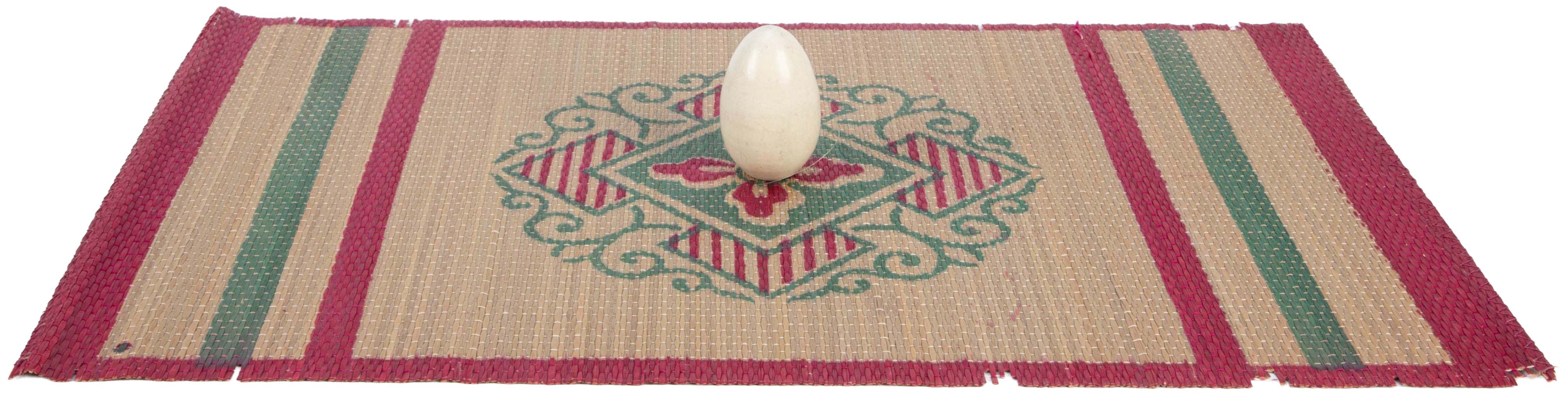 The performer shows both sides of the bamboo mat or screen, and the next moment, an egg appears from nowhere. Originally invented by Joe Karson. Uses a loop egg instead of the traditional hookup. Good condition.