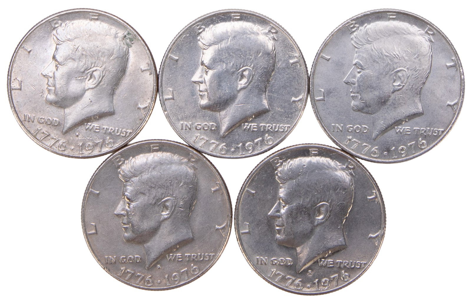 A set of four Bicentennial Kennedy Half-Dollar coins and a finely made expanded shell. The shell is very well turned. Very good condition.