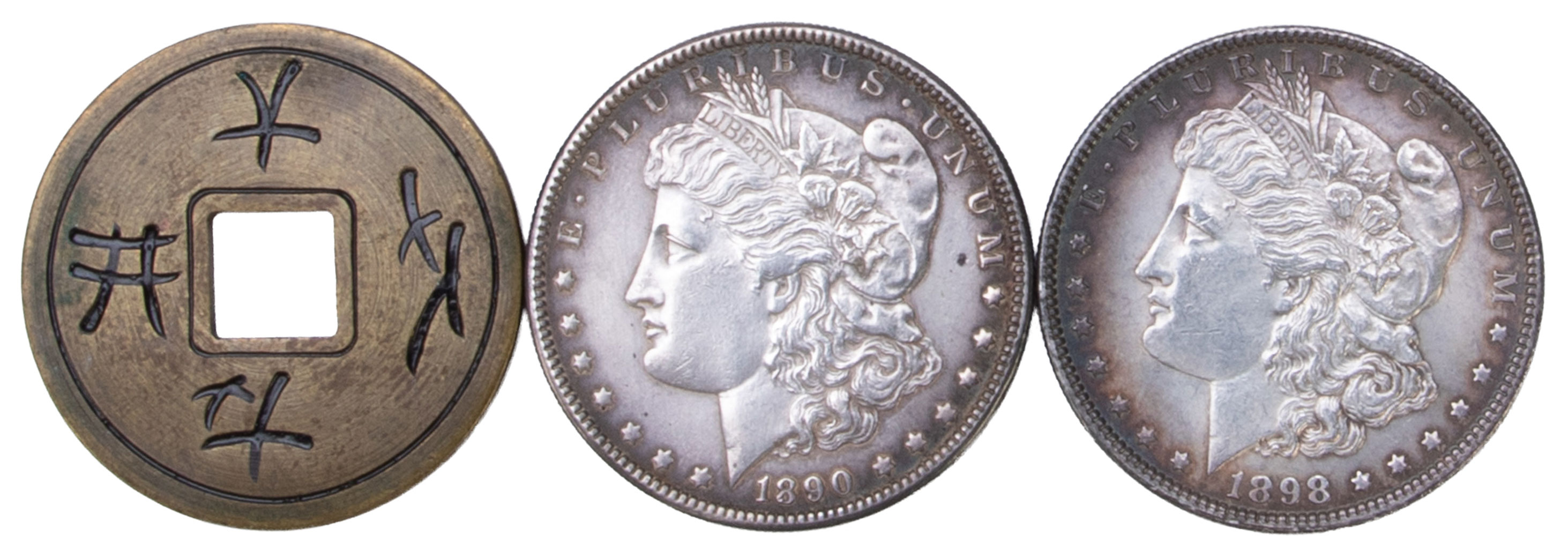 A real Morgan dollar magically changes into a "Chinese" coin. Good condition.