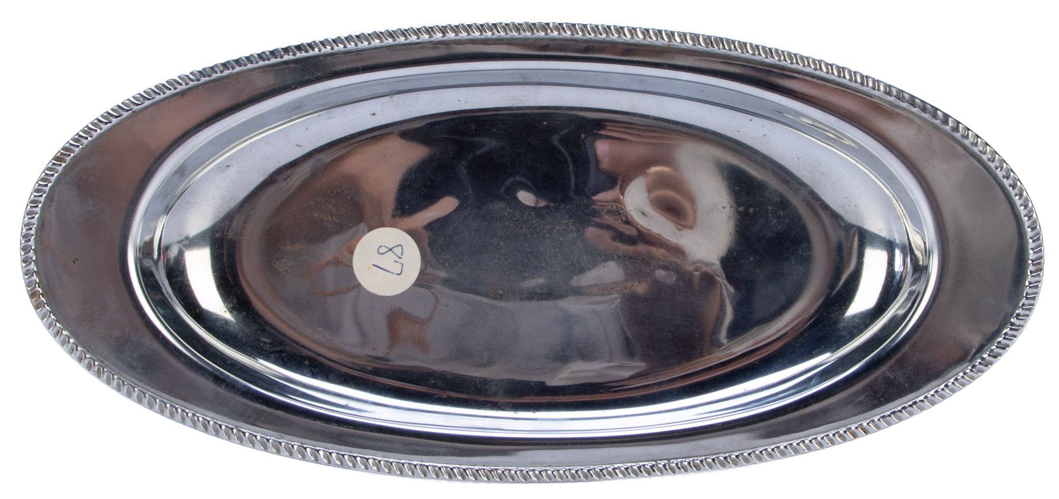 Oval metal tray used for the multiplication of coins. Unusual shape and construction of secret compartment under tray. Mild wear, else in very good condition.