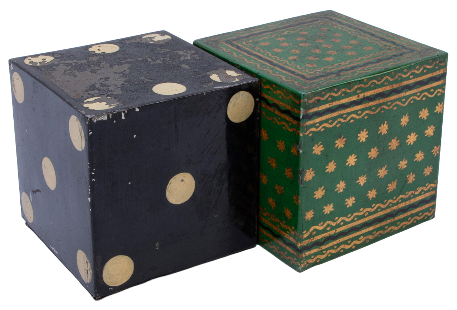 A die placed on a plate changes into another object inside the cover. Toleware construction, and lacking the plate or tray that holds back the top of the six-sided shell. Even so, a rare item from the Victorian era. Paint chips and wear. Fair condition.