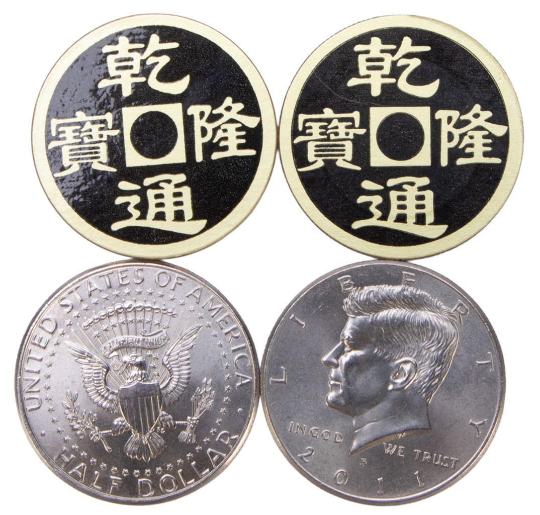 Double Face Super Triple Coin trick. A split coin set that can be used for a variety of routines, including the almost-visible transformation of the coins from silver to Chinese coins. Very good condition.
