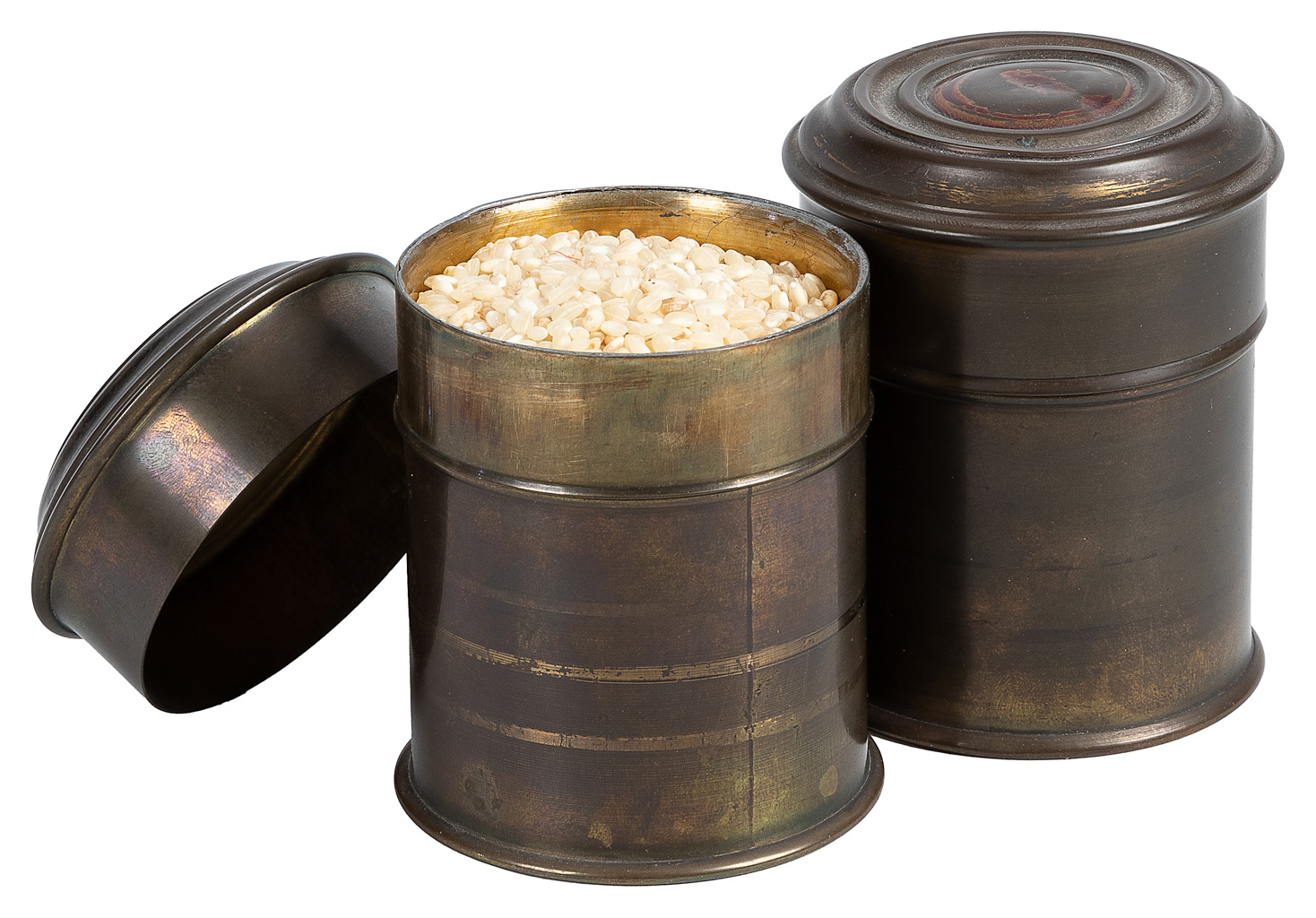 Millet placed in one canister vanishes, changes into other objects, or appears in the other matching vessel. Lacquer finish rubbed; working well, and precisely made. From the collection of Edwin A. Dawes. Very good condition.