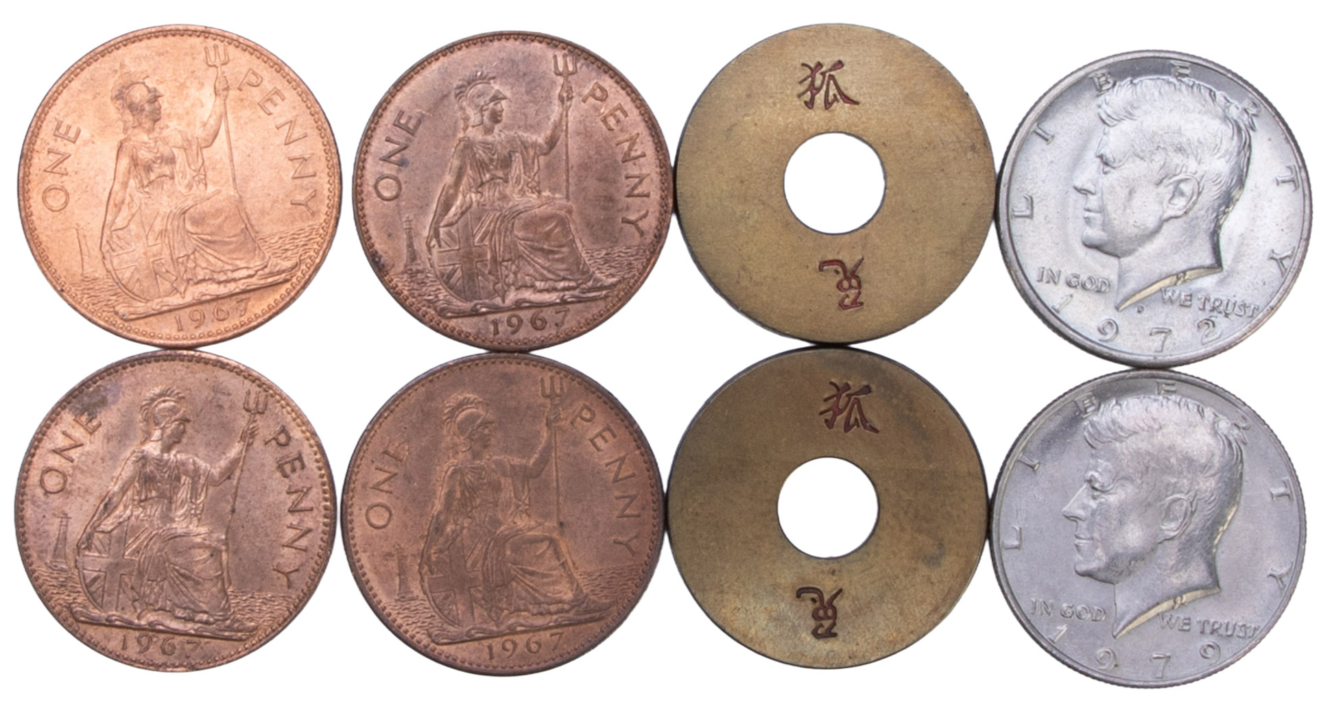 Three previously examined coins are used. An American half dollar, an English penny, and a Chinese coin. The penny and the Chinese coin are placed in the right hand, the half dollar in the left. Without any suspicious moves, the coins transpose! The penny is placed in the pocket but instantly returns to the hand. The hall-dollar vanishes from the hand and appears in the pocket. Next, the Chinese coin and the penny are transposed with the remaining coin in the hand. This is repeated, with variations, but at the end of this series of bewildering surprises, the coins are handed out for examination again. Includes instructions. Very good condition.