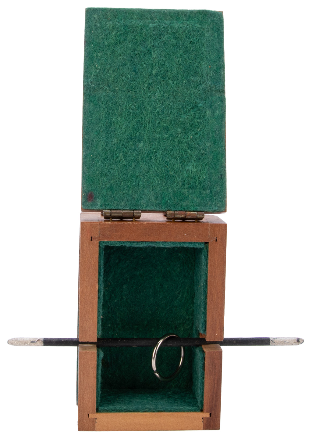 A metal ring placed inside the cabinet is suddenly found suspended from a solid wooden rod driven through both sides. Includes instructions. Small dents to the box, else in good condition.