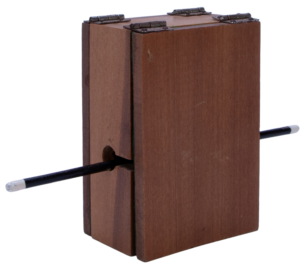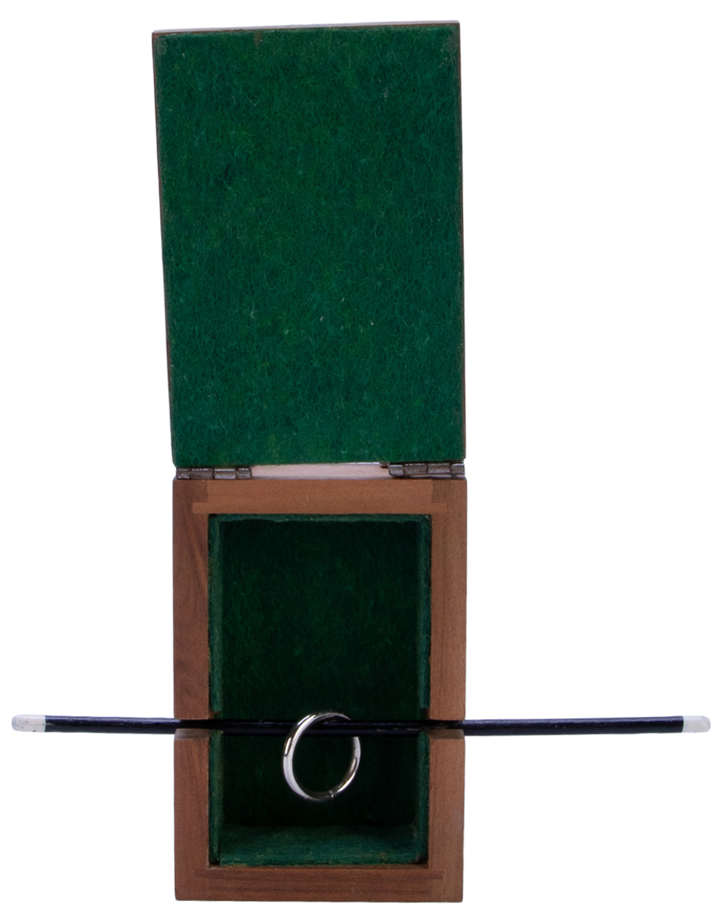A metal ring placed inside the cabinet is suddenly found suspended from a solid wooden rod driven through both sides. Some wear to the wand, else in very good condition.