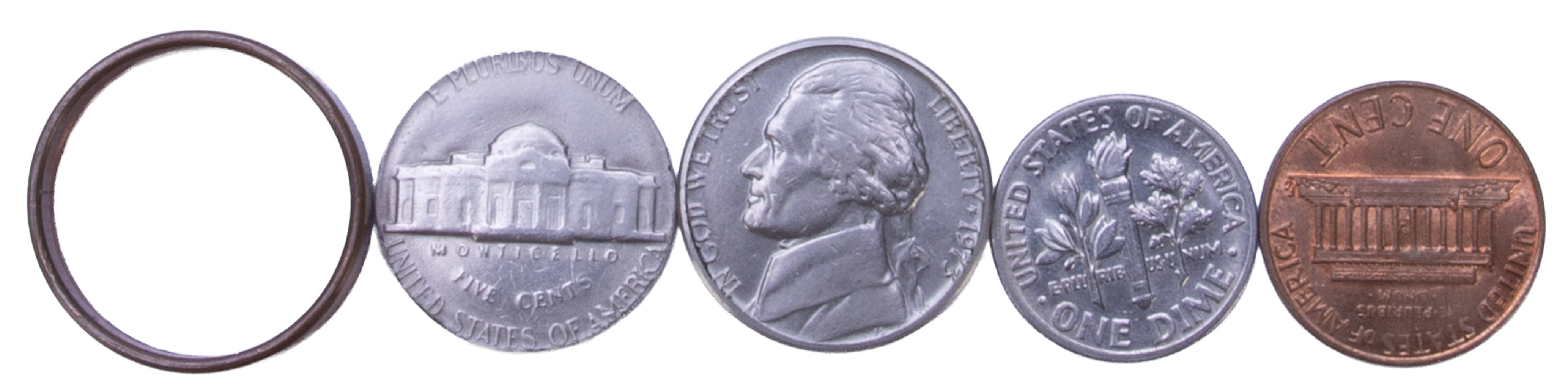 Locking 21 Cent Trick where a small handful of pocket change vanishes from the magician's hand after only one coin is removed and cleanly shown. Includes a metal bang ring. Very good condition.