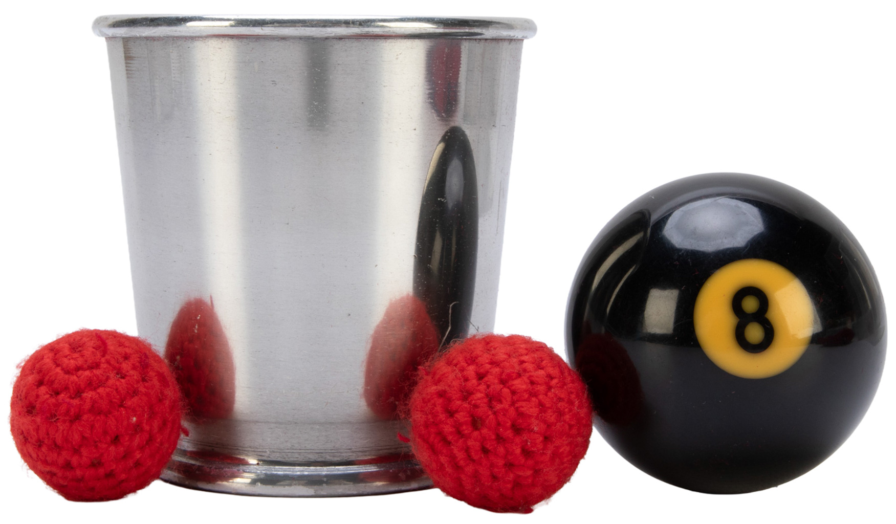 An aluminum chop cup with a strong magnet in the base, including a small magnetic ball, a regular crochet ball, and a billiard ball. With a red velvet carrying case. A few scratches, else in very good condition.