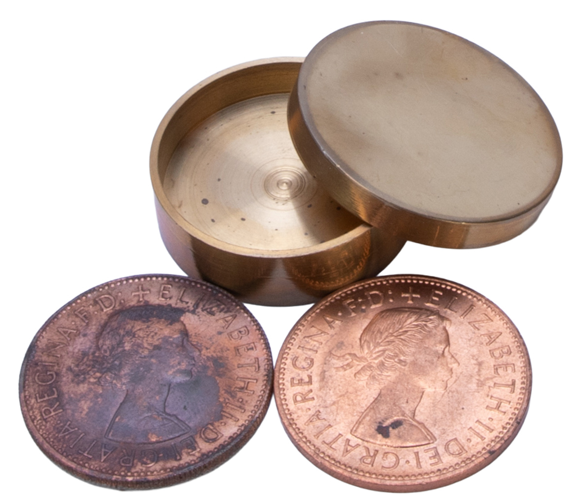 An empty coin box is shown, and inside are two silver coins. A copper coin is vanished and reappears inside the box sandwiched between the two silver coins. All three coins are then placed back in the box, then another silver coin transposes into the copper coin and flies into the box. Next, a spectator chooses either copper or silver, and his coin vanishes only to appear inside the box moments later. For a final effect, a copper is placed between two silvers are dropped into the coin box. The remaining silver coin is vanished and the spectators, expecting another transposition, are amazed to find inside the box… a silver trapped between two copper! Includes instructions. Needs to supply two half-dollar coins. Oxidation on one of the coppers, else in good condition.