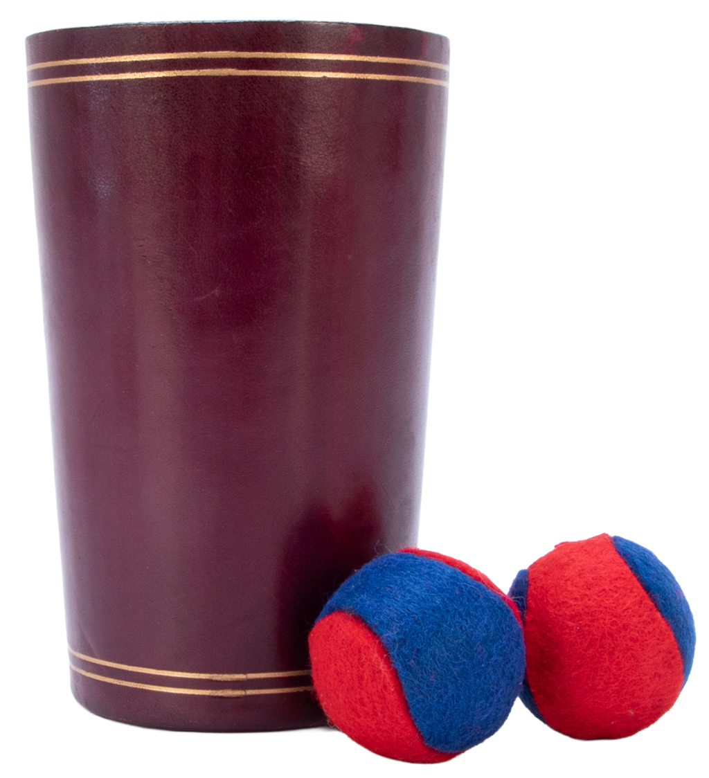 Purple leather chop cup embossed in gold. Includes two felt-covered cloth balls; one gimmicked, the other ungimmicked. With red carrying bag. Fine and smooth leather finish. Very good condition.
