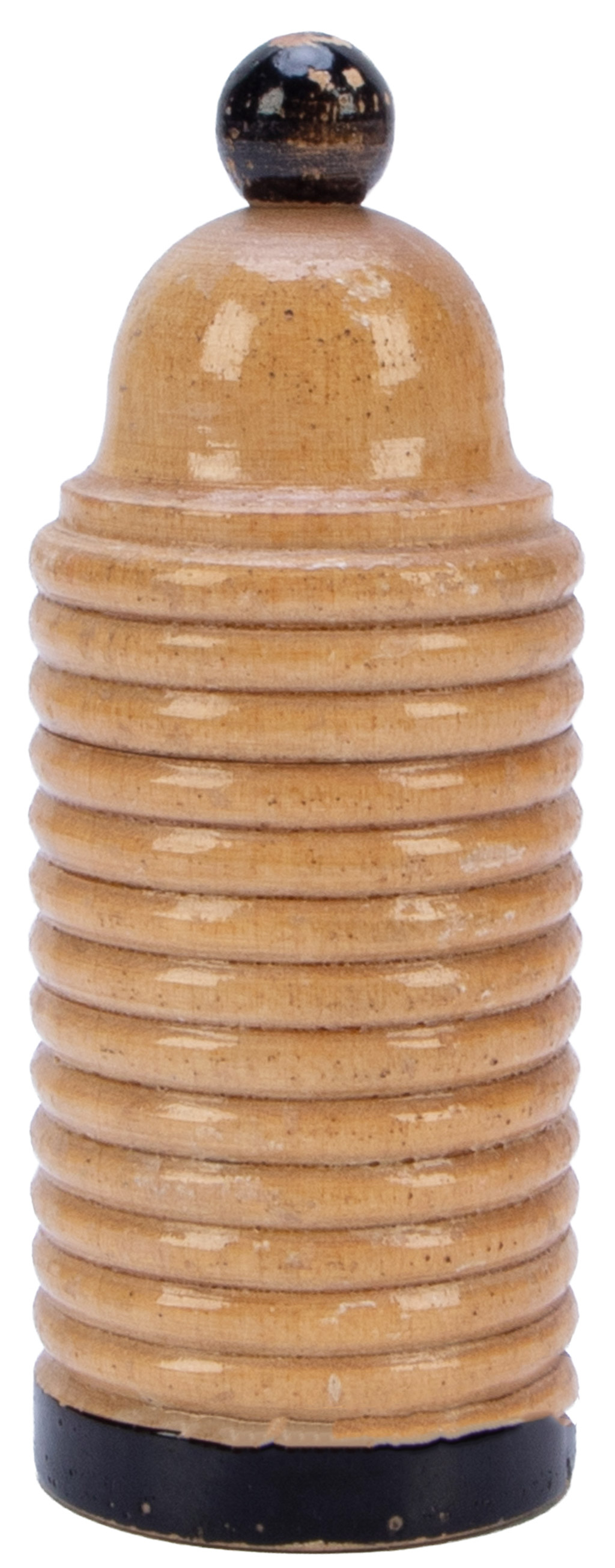 Turned wooden bank with built-in rattle gimmick; a coin, dropped inside, is heard to rattle about, yet vanishes moments later and reappears in a nest of boxes or elsewhere. Small paint chips and wear, else in good condition.