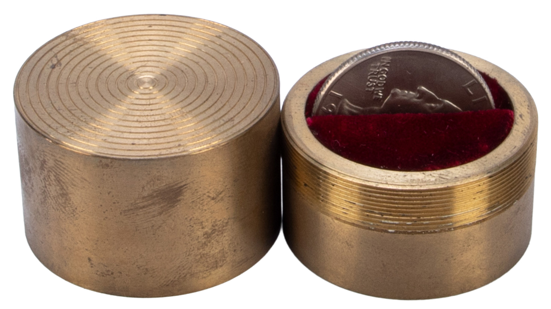 A borrowed ring or other small object under a handkerchief disappear, and a moment later is found inside the sealed brass box, which must be unscrewed to be opened. Includes a small pouch. Some wear, else in very good condition. Precision made from brass.