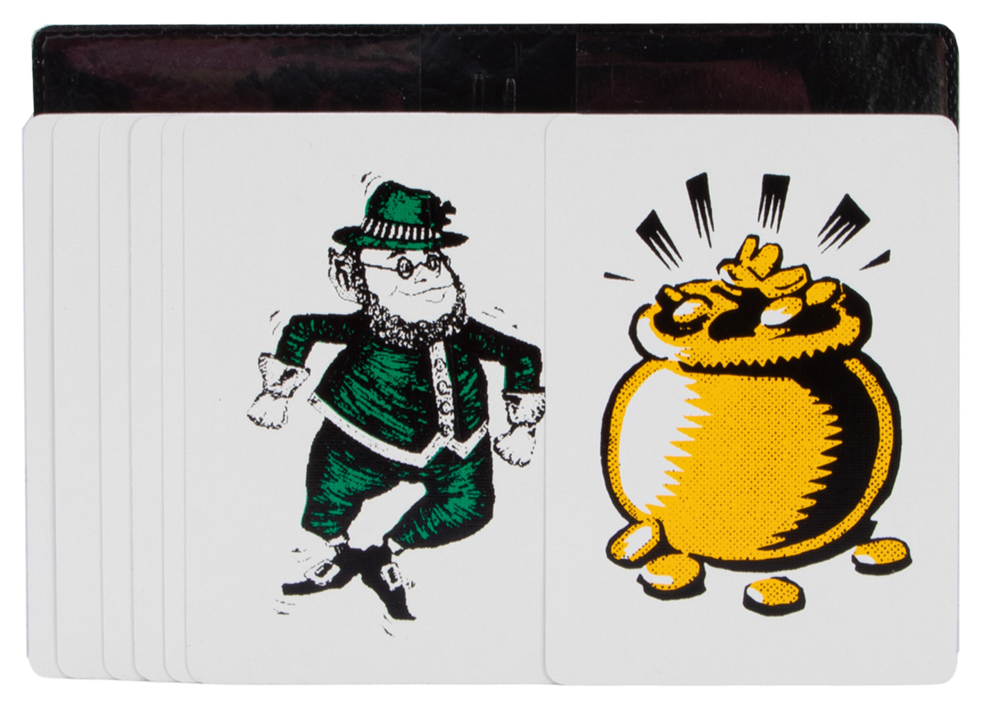 You show two four-card packets of face-up cards with a leprechaun on each card. A leprechaun is placed face down on top of a face-up packet, and all the leprechauns are now face down. You place a face-up leprechaun on top, and all the others, in sympathy, turn face up too. This is repeated several times. All the way through the routine, you showed normal backs. The leprechauns are turned over, and all the backs are different colors! Turn over some cards and show that they have big pots of gold printed on them! Includes instructions. The case a bit sticky, else in good condition.
