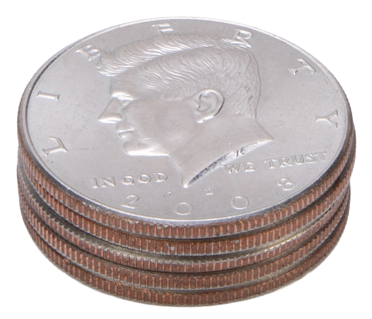A stack of half-dollar coins turns into a stack of quarters. Very good condition.