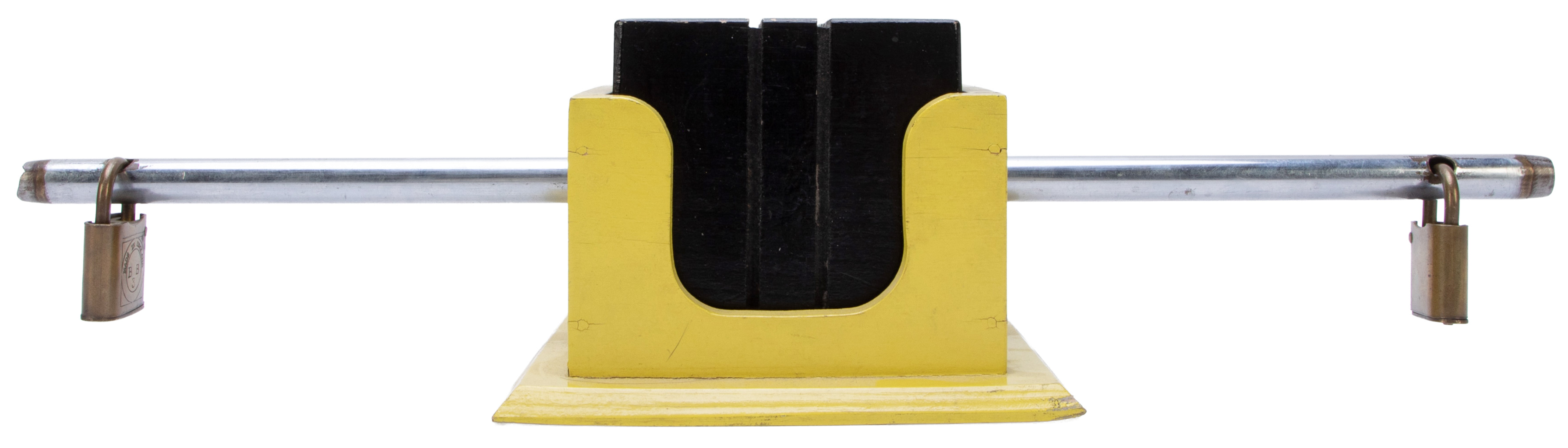 Only the magician can pass the block through the locked bar running through its center. The lock is visibly released from the bar, as if melting through the metal, and is then visibly replaced. Good working condition, but lacking the key to open the vintage padlocks at the ends of the bar, else very good. This is likely the Supreme magic model of this classic trick most commonly seen as an Abbott-made model. Hard to find. Good condition.