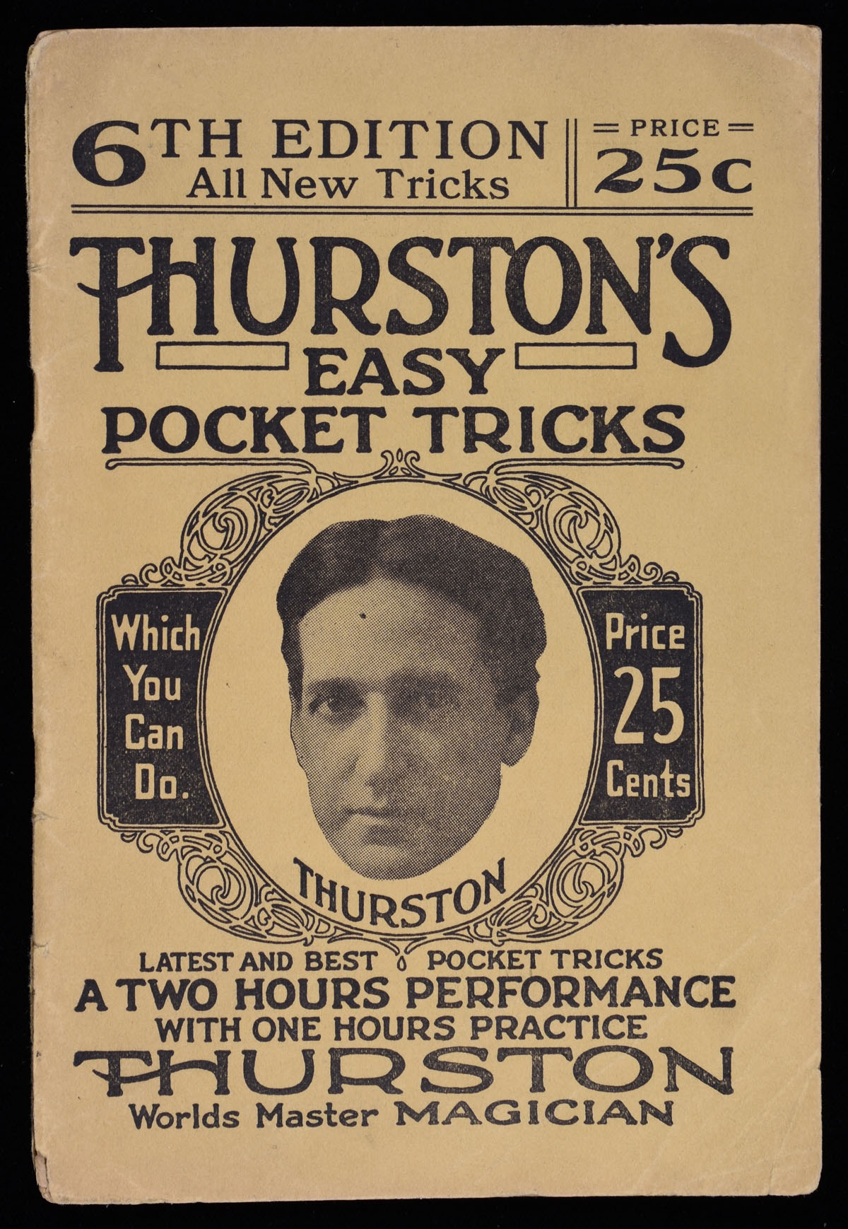 Original wrappers, illustrated, 48 pages. "6th Edition, All New Tricks." A small booklet describing a variety of pocket tricks with photographic images of Thurston performing them, as well as "Thurston's Astrological Chart" at the end. Pages and wrappers toned, spine worn with some tears, page 39 torn.