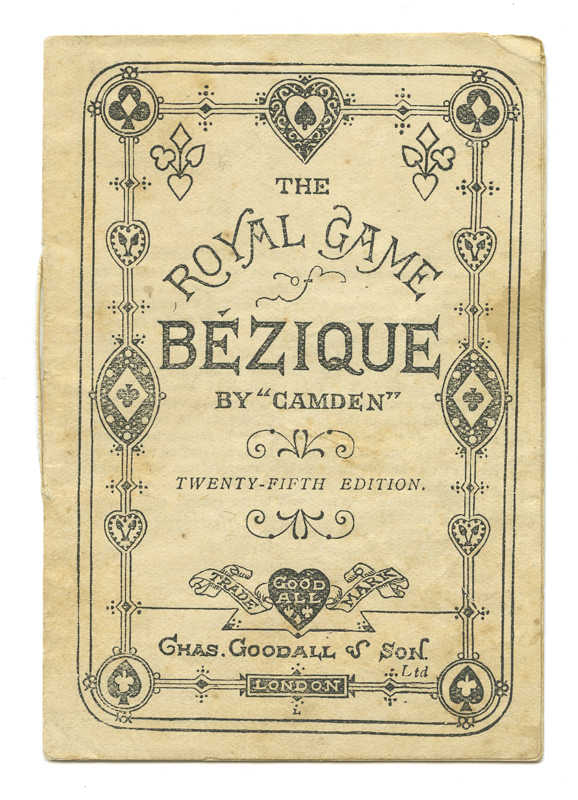 Small, 11-page booklet on the game of bezique. 25th Edition. Produced by the well-known English card company, Charles Goodall and Son, generally sold with the necessary decks and tools for the game. Fragile, toning and some soiling resulting in small losses. Fair.