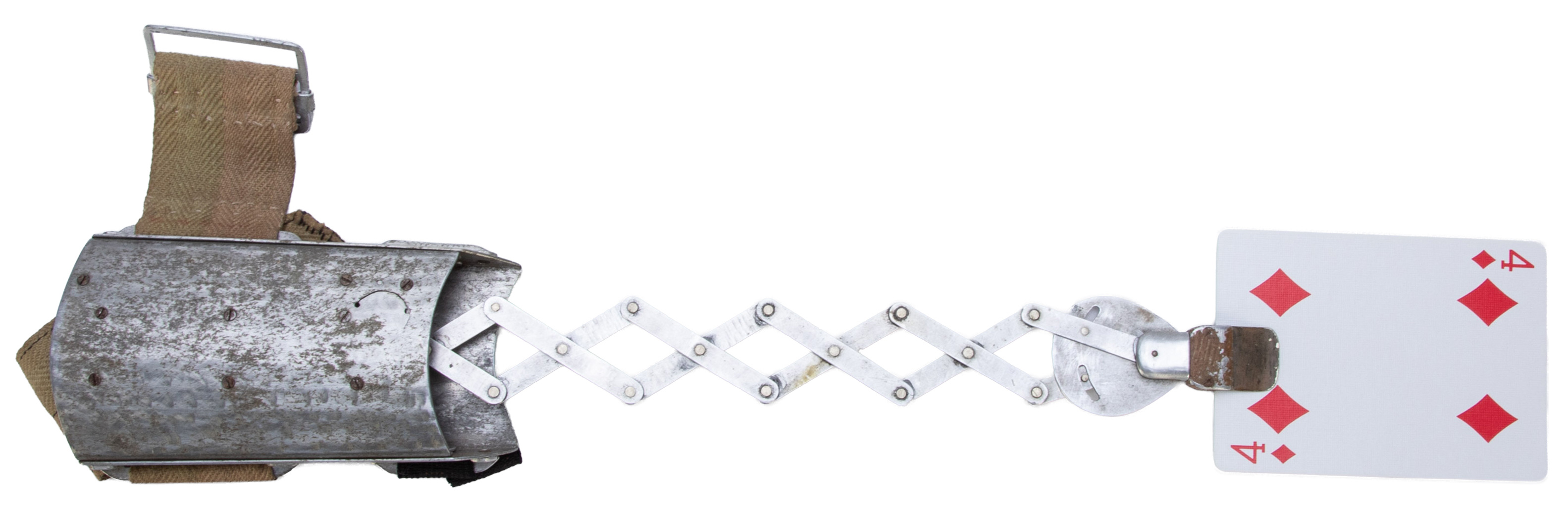 Finely manufactured aluminum device with lazy tongs incorporated into an oblong box, to be worn on the magician’s arm under the shirt sleeve. When activated, the “thief” end of the device appears at the end of the cuff, and an item in the hand may be deposited in the device or the hand as needed. With a variety of attachments for coins, cards, cigarettes, and billets, which may be attached to the moving end of the apparatus. Often confused for a Jon Martin prop, but made by Hammerton in the Martin style. Some wear, else in good condition. From Ken Klosterman's Salon de Magie.