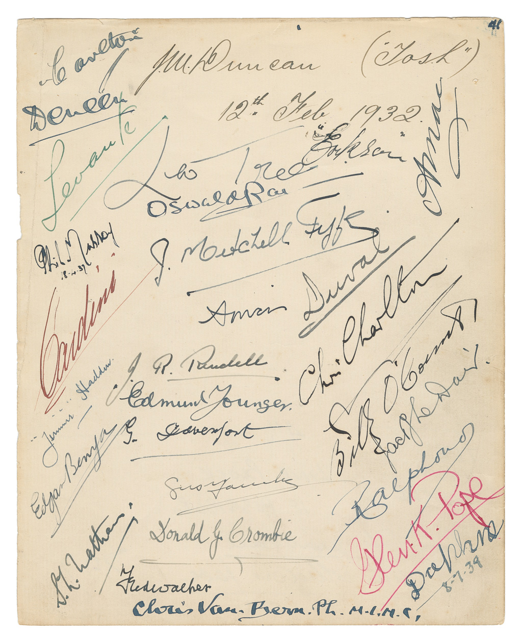 Includes the inked and pencil signatures from esteemed magicians, including Cardini, Carlton, Les Levante, Oswald Rae, Chris Charlton, Edmund Younger, Edgar Benja, Chris Van Bern, Jack LeDair, Amon Duval, Bill Amac, George Davenport, Fred Walker, Donald J. Crombie, J Mitchell Fyfe, and more. Very good condition.