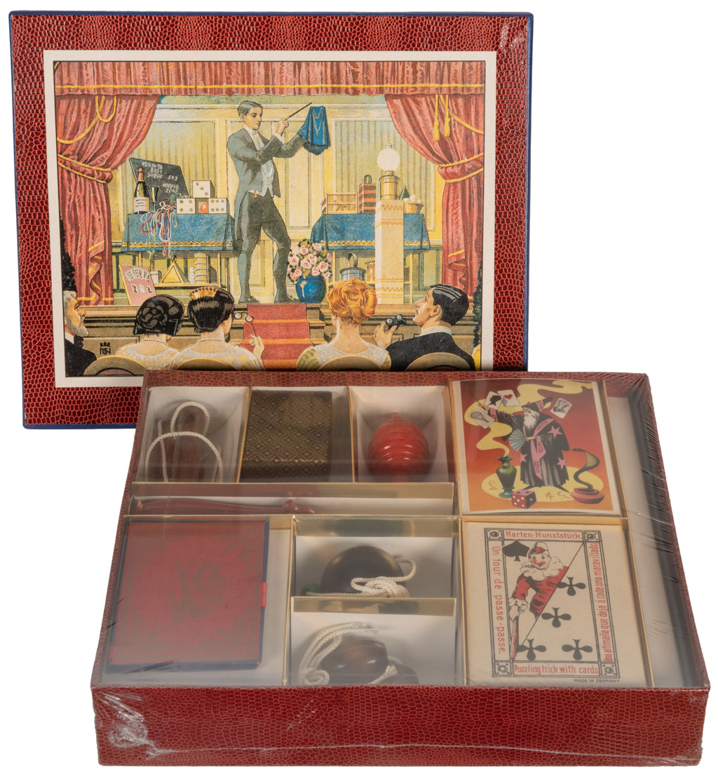Modern reproduction of an antique German magic set with classic props including Magic Awl, Inseparable Beads, Strange Little Wallet, and others. Boxed with instructions, as new.
