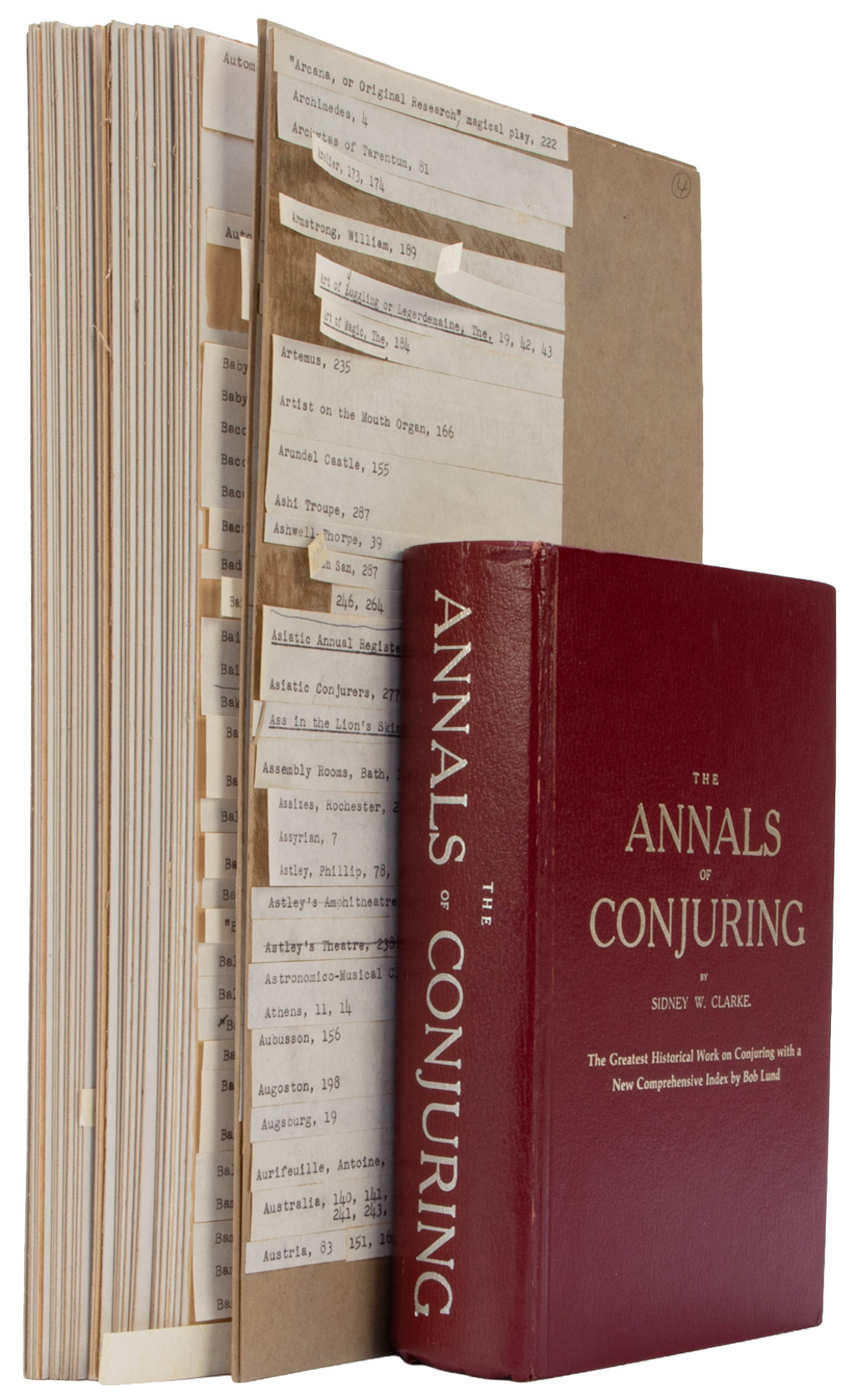 The original index to the Annals of Conjuring (as published in the Magic Wand), preliminary to turning finished copy over to Jay Marshall, pasted up by Robert Lund the man who compiled the information. (The work would eventually be published by Magico, not Jay Marshall). 34 sheets, together with the finished book. Very good condition.