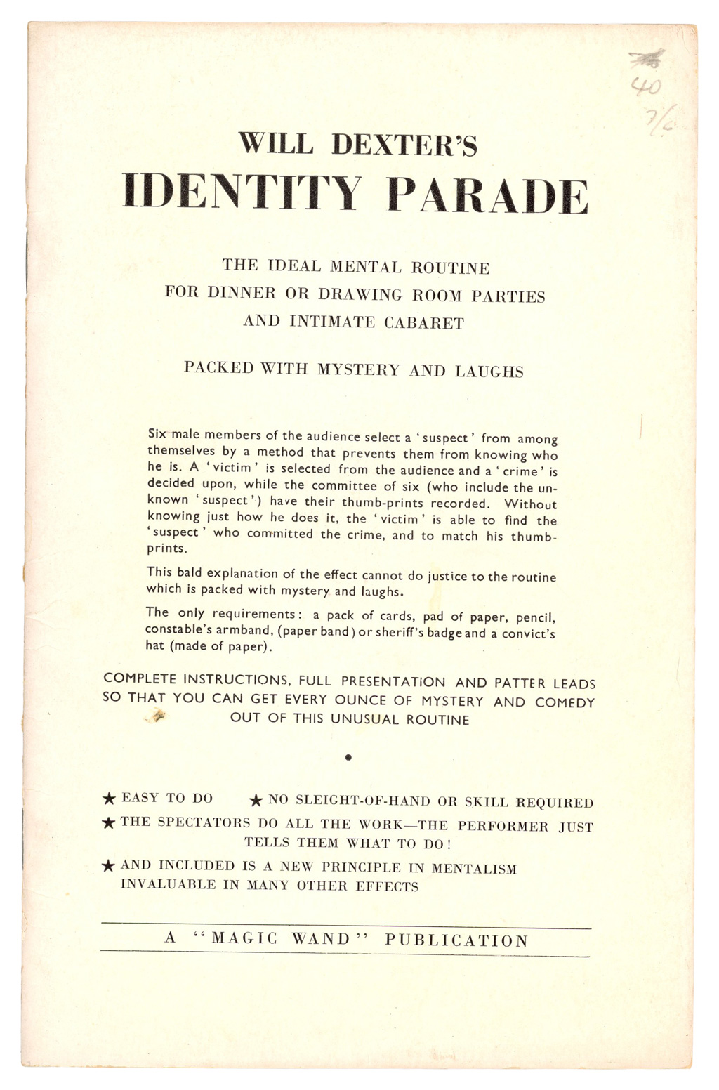 Will Dexter's Identity Parade: An Unusual Mental Routine That Is Packed with Mystery and Laughs. Wrappers, 11 pages. Mild toning to pages, else in very good condition.
