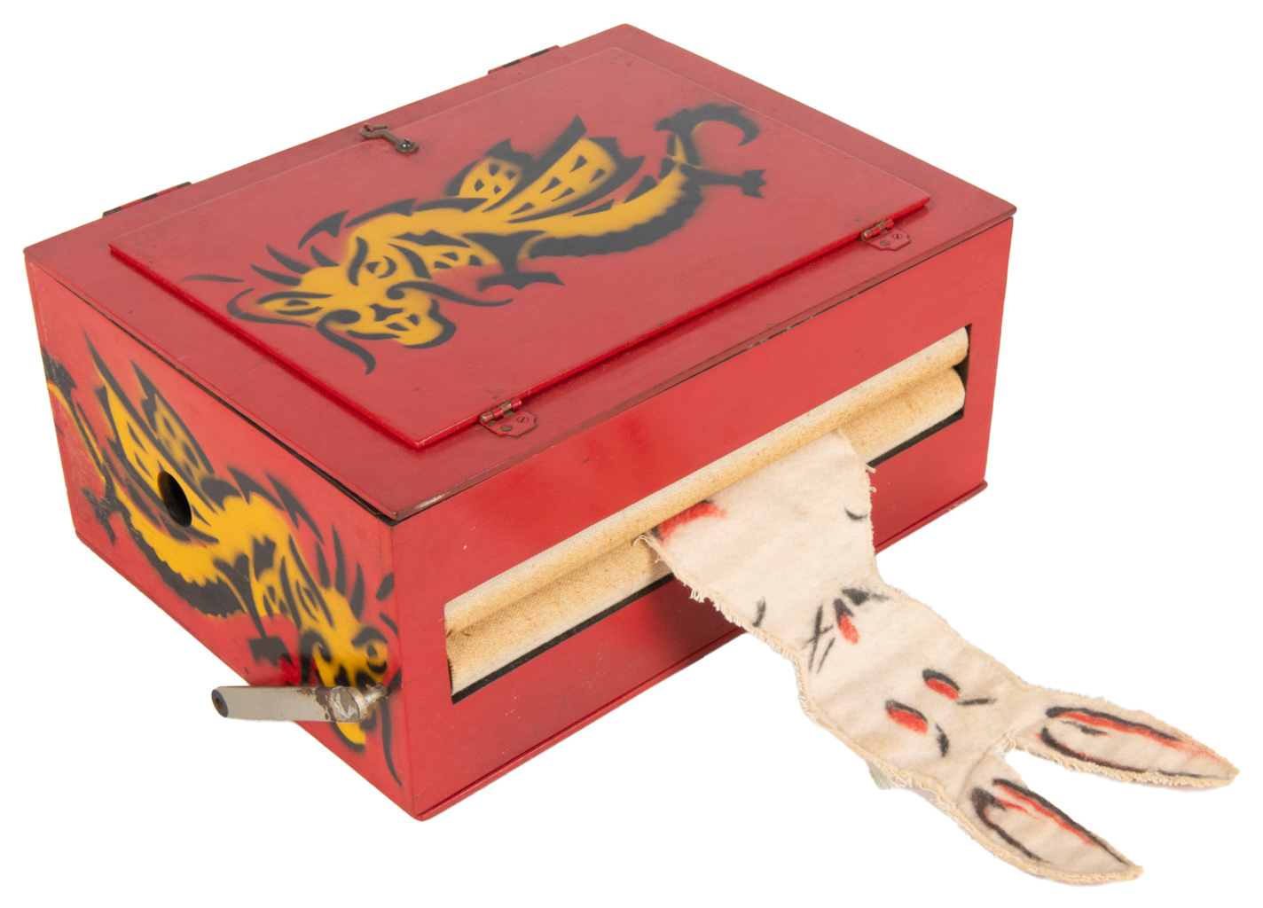A rabbit placed in the box is wrung out of the rollers on its side in a flattened condition. The box is then flipped open to show that the live animal is indeed gone. Unusual paint scheme by Abbott's with the dragons used on the company's "Superior" tables. Some soiling and wear, else in good condition.