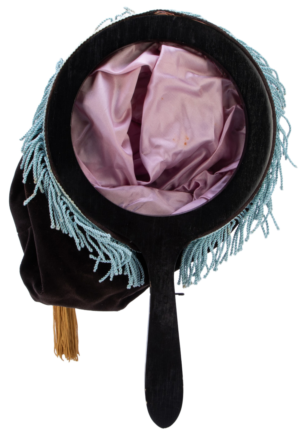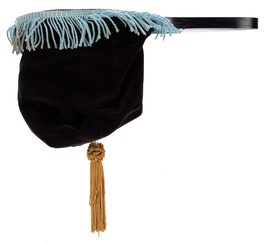A classic change bag with a wooden handle and a tassel around the perimeter of the bag. Some toning and soiling, else in good condition.