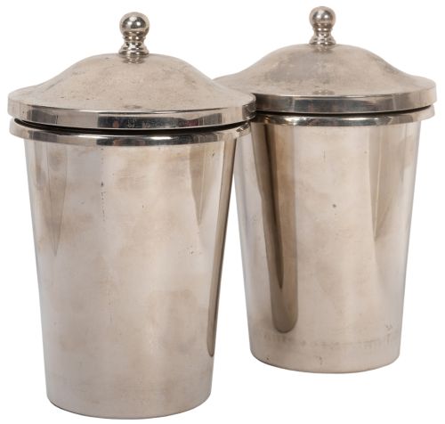 The magician scoops bran or confetti into two nickel-plated cups and clamps lids on them. When removing the lids a moment later, one cup is now full of hot coffee and the other is full of milk. Usual light wear to finish.