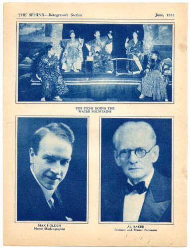 A clipped page from the June 1931 issue of The Sphinx, notable for its early photograph of "Bessie" and Harry Houdini. Also photographed: William E. Robinson, E. Maro, Horace Goldin, Ten Itchi, Max Holden, and Al Baker. Good condition.