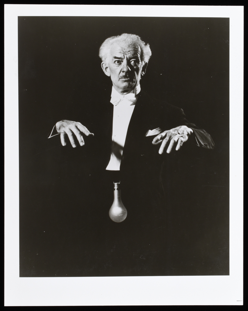 Reprint photograph of Blackstone, Sr., performing The Floating Lightbulb trick. Mild scratching, else very good. Stamp on reverse.