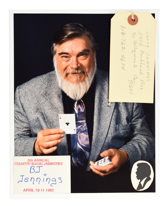 Photograph of Larry Jennings holding a deck of cards, a small cut silhouette, an address tag, and B. J. Jennings' name card for 5th Annual Country Magic Jamboree in 1992. Very good condition.