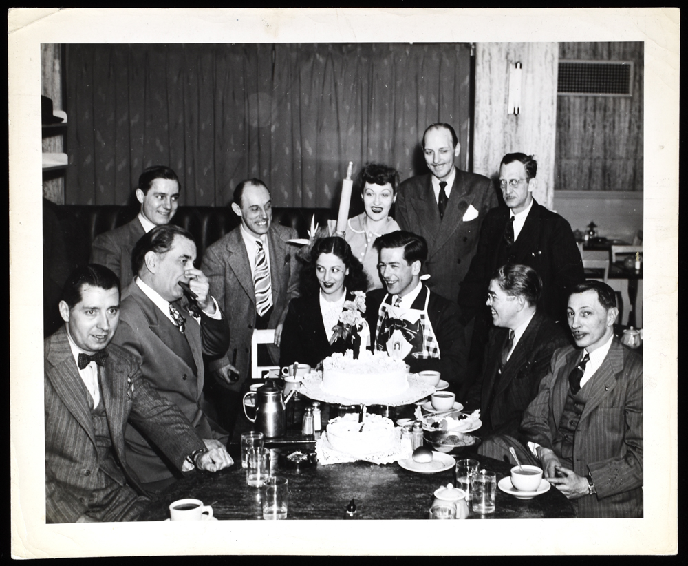 Two black and white photographs of Dorny at a wedding party, sitting near the bride and groom joking around as they prepare to cut the cake. Also in the photo are Ade Duval, Johnny Platt, and Chic Schoke. Edgewear, some soiling, creases. Fair to good condition.