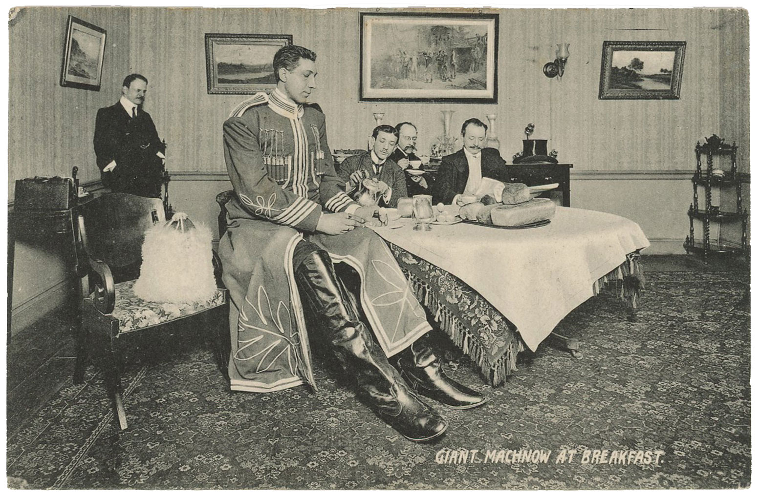 Postcard of Giant Machnow, the music hall and fairground giant, pictured at Breakfast. Used. Mild toning, else in very good condition.