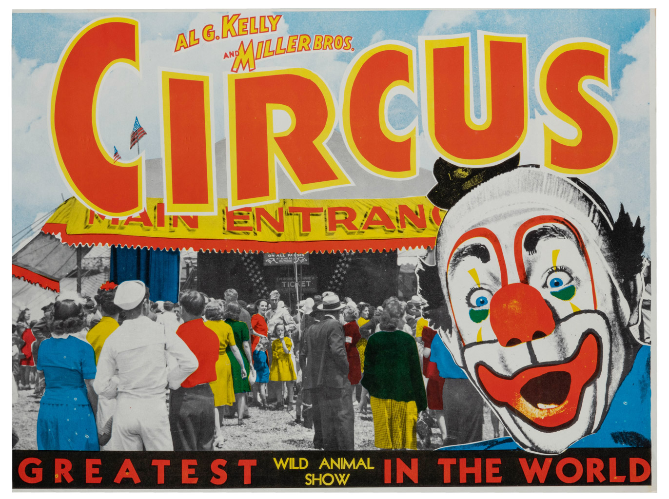Half-sheet poster advertising “Greatest Wild Animal Show in the World,” depicting a clown and a crowd in front of a circus tent. Unmounted. A.