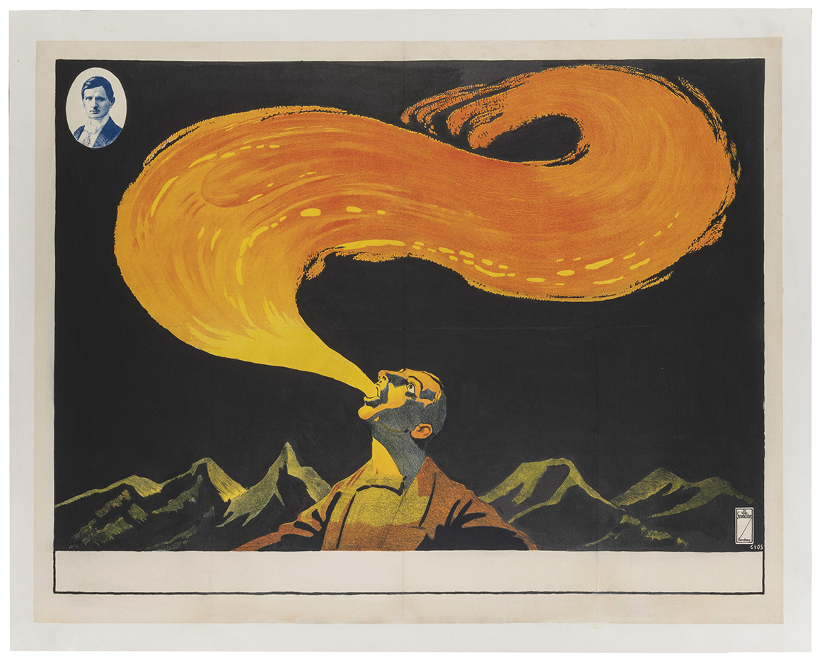 Vibrant one-sheet lithograph depicting a man blowing a huge plume of fire from his mouth, in the background, a mountain scene appears. A portrait of the performer appears in the upper left. A rare poster. See Charles & Regina Reynolds, "100 Years of Magic Posters," page 23. Faint crease lines, Linen backed. A-. Uncommon.