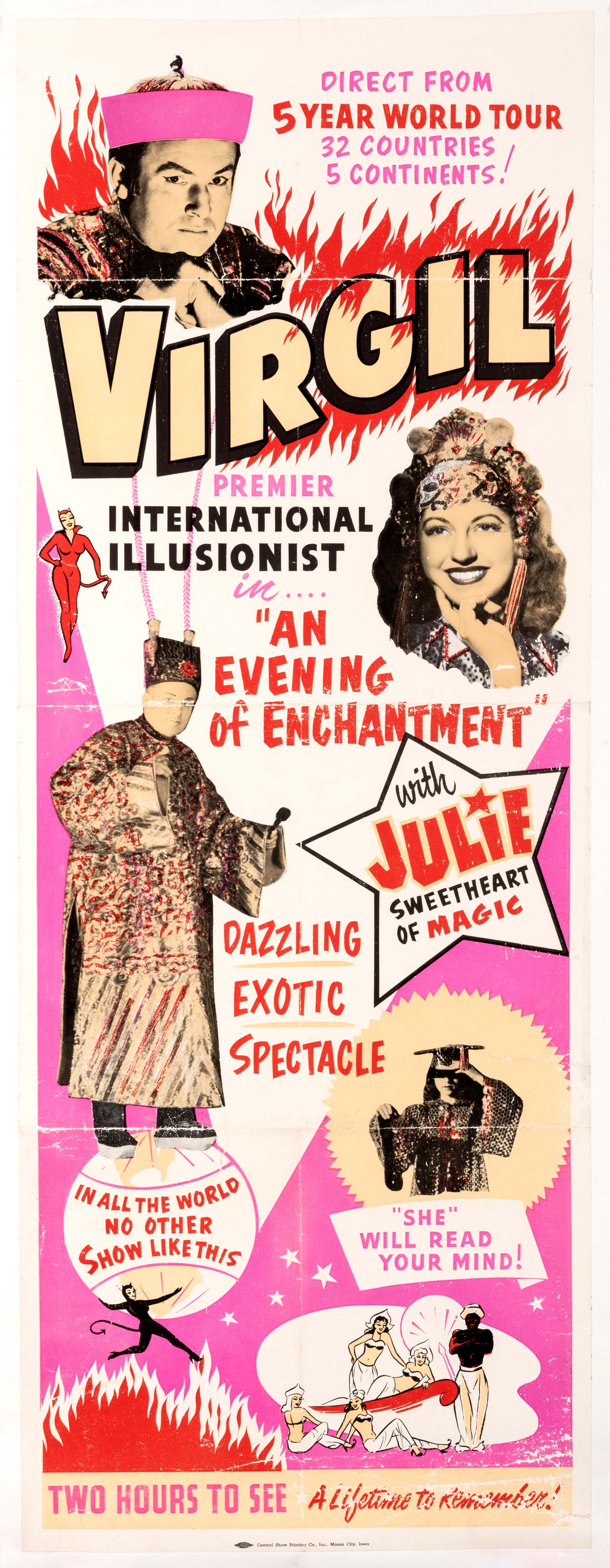 Printed with pink, red, and tan colors, this panel poster advertises "An Evening of Enchantment." Linen backed. Significant wear prior to backing, expert repair; bottom margin of linen curling. B-.