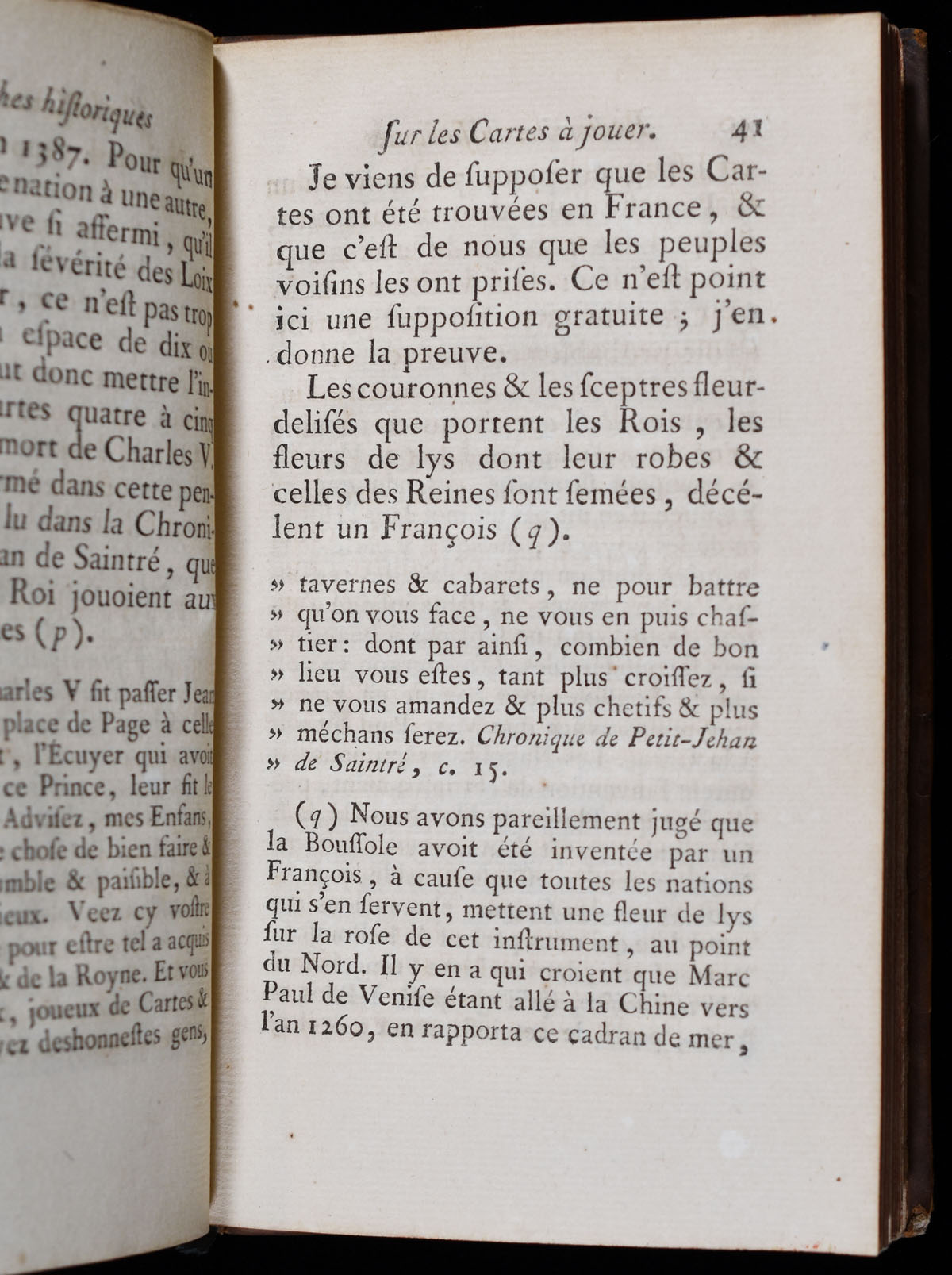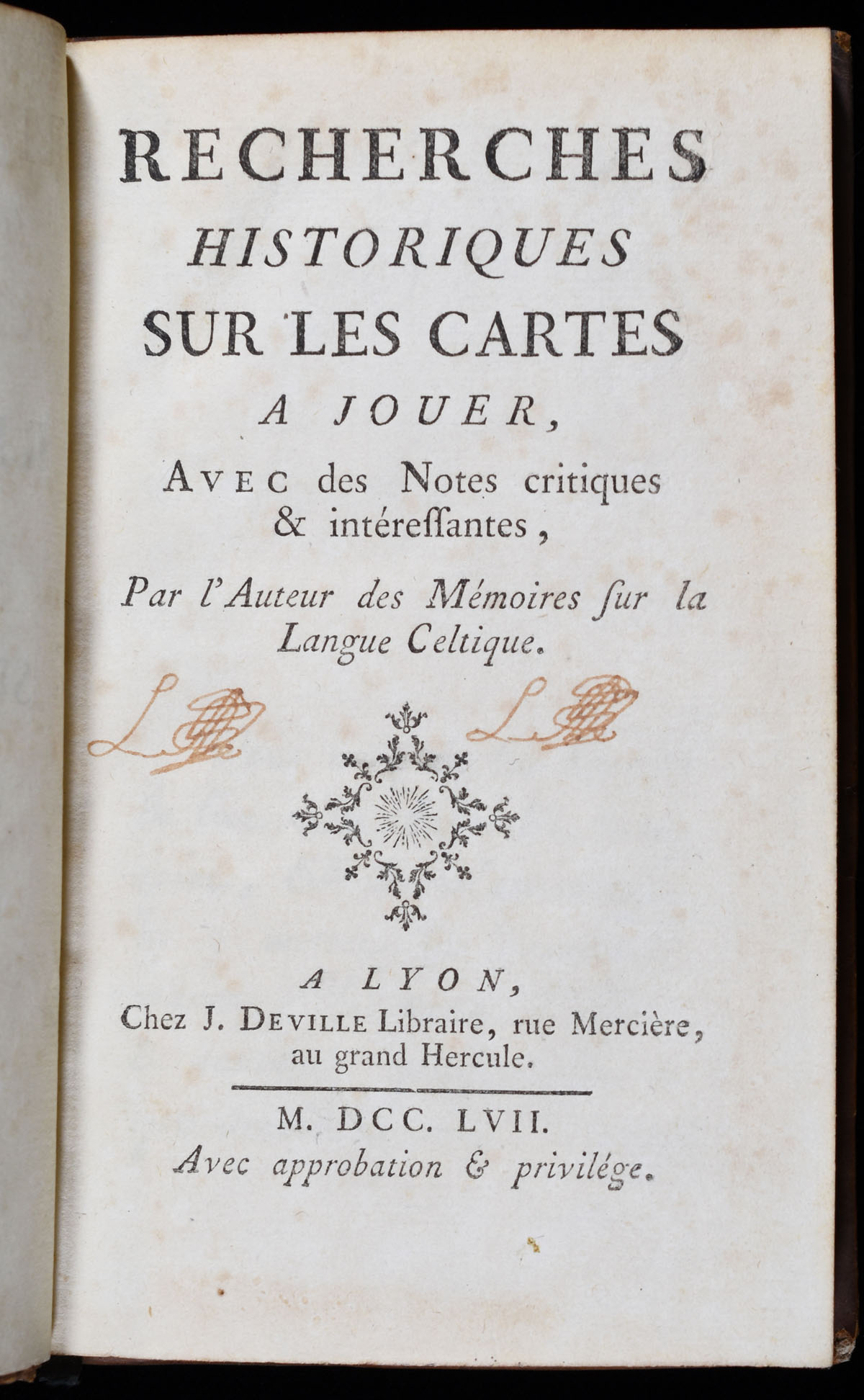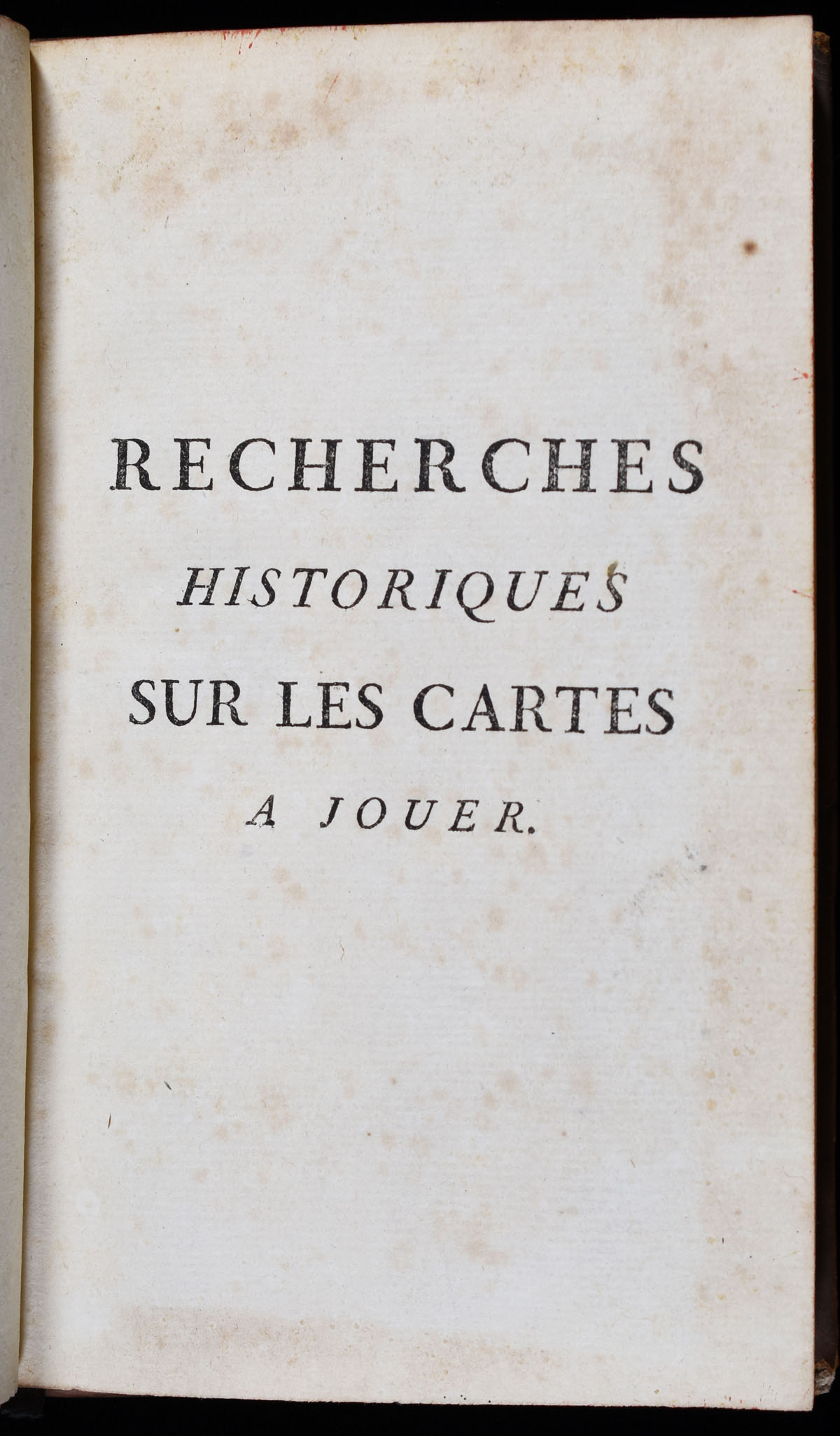 Recherches Historiques Sur Les Cartes A Jouer, Avec des Notes critiques et intereffantes, Par l'Auteur des Memoires sur la Langue Celtique. Full mottled calf, raised spine, gilt tooling in spine compartments, inlaid brown morocco title compartment with gilt lettering, page edges red. First Edition. 4 leaves, p. [1] 2-163 + 2 leaves advts. Spotting on first few leaves, red markings in corners of final few leaves, handwritten notes from previous owner on last leaf, possibly dated 1780. Else contents in fine condition. Binding shows shelf wear and wear to hinges, small tear in front hinge. Ex libris M. Mejean.
