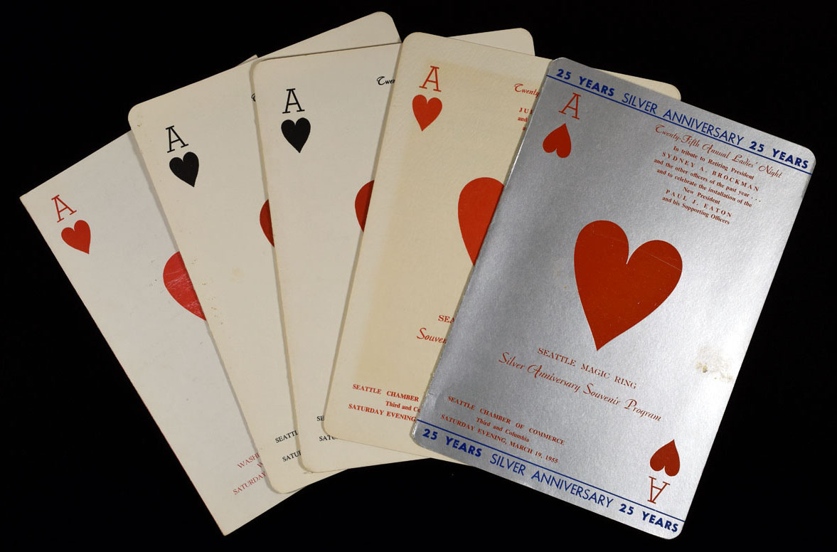 Set of five folded programs for the Seattle Magic Ring Ladies' Night for 1940, 1952 (2 copies), 1954, and 1955. The Wizard's Supper and magic shows by the members of local Magical Clubs. Two-color programs with illustrations of rabbits and magicians. Minor scuffing and soiling.