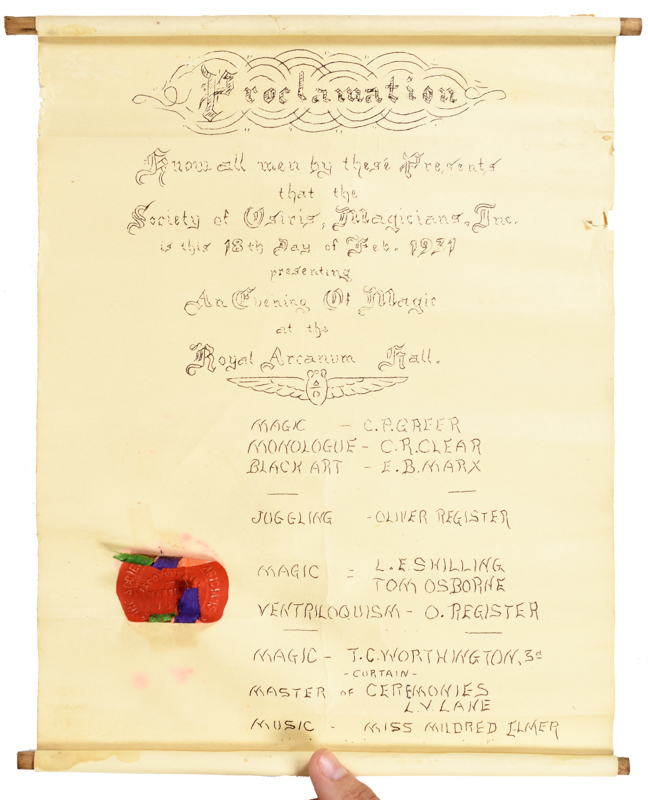 Scroll-like program for the Society of Osiris Magicians. Acts on the bill include ventriloquism and juggling. Some chips and toning, fair to good condition. With a red embossed seal incorporated into the design. Curled as expected.